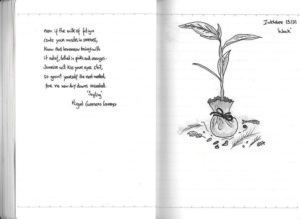 Even if the prompt might have alluded to actual weakness, I wanted to portray growth rather than stagnant weakness; making up for the heavy subject from yesterday's Inktober illustration. The poem goes well along with sapling illustration. Below is the transcription: